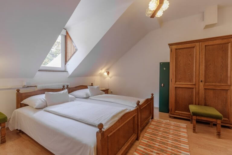 Az emeleti Standard szobákban kényelmes, igény szerint külön álló vagy franciaágy biztosítja a kényelmes pihenést, a hálótérből nyílik a zuhanyzós fürdőszoba; a szoba maximum egy pótággyal bővíthető.